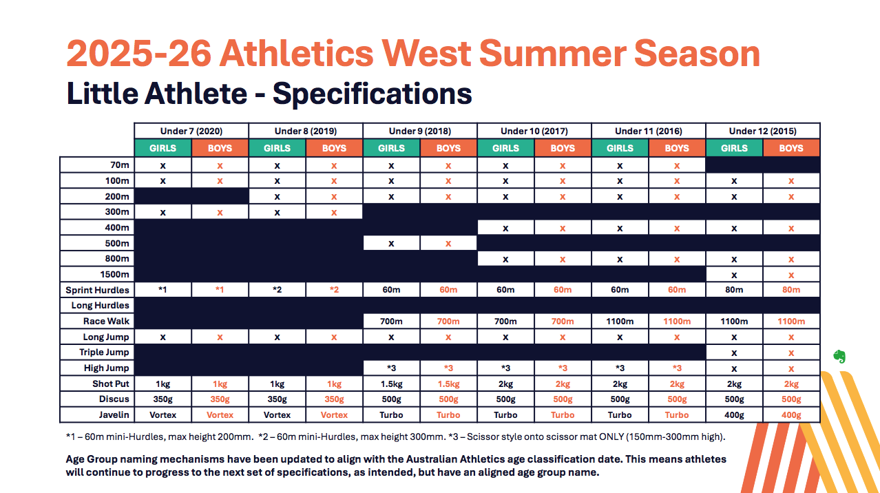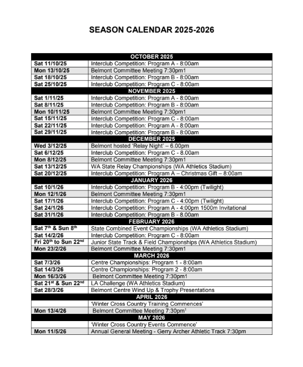 The Little Athletics calendar is broken into two separate seasons. The first is the summer Track and Field season (October – March), and the second is the winter (April – August) Cross Country Runs and Road Walks.