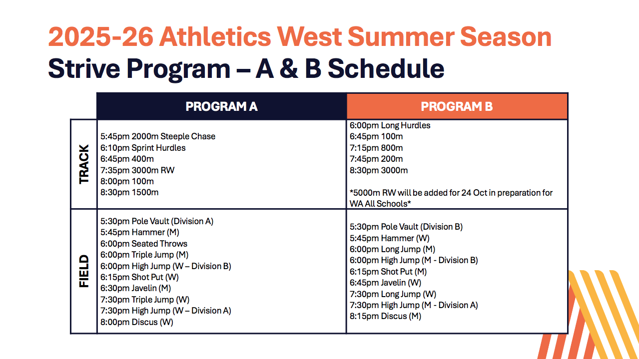 The Strive Program is a weekly competition held throughout September – March, predominantly on Friday evenings at the WA Athletics Stadium in Mt Claremont. The Strive program is aimed at Junior and Senior Athletes looking to progress to State and National events.