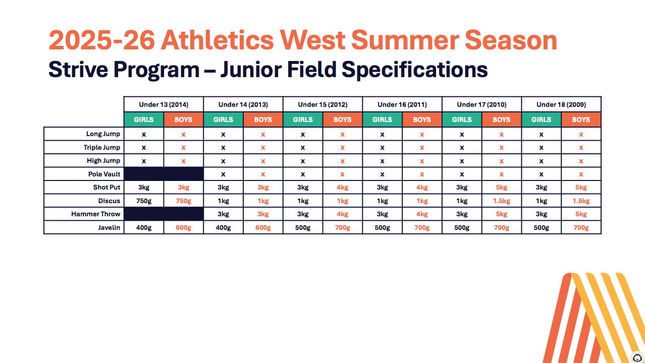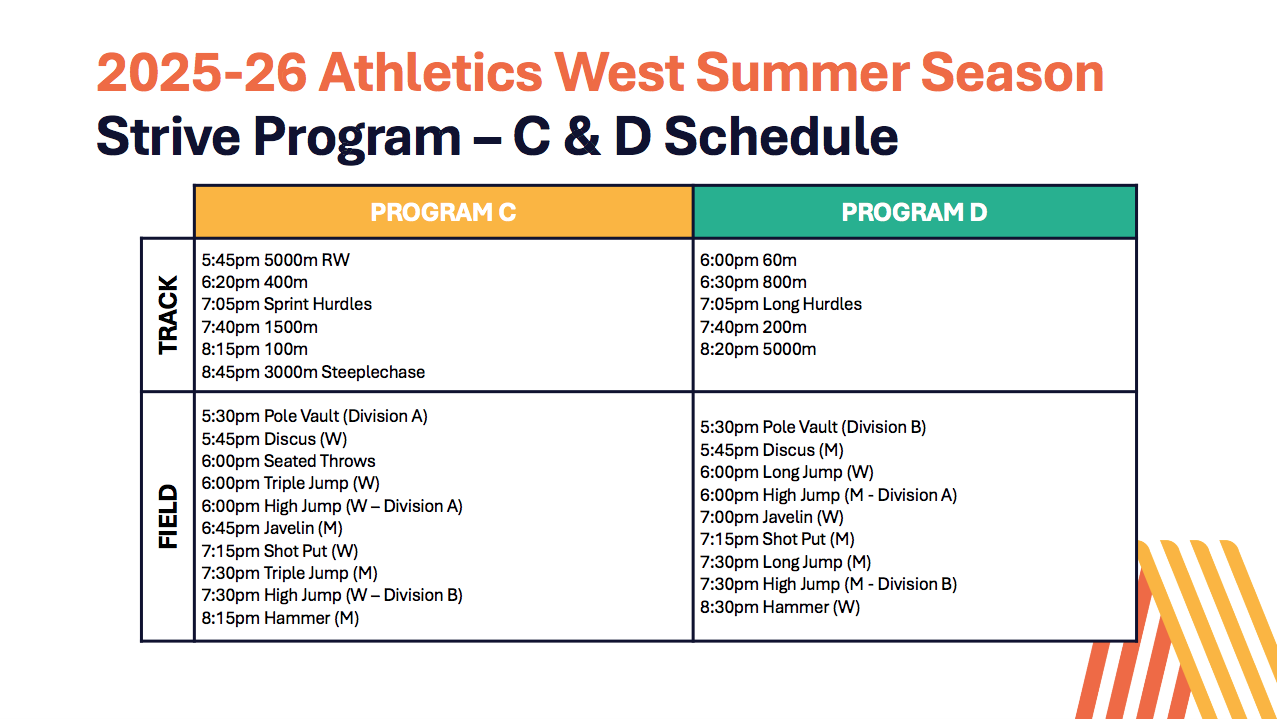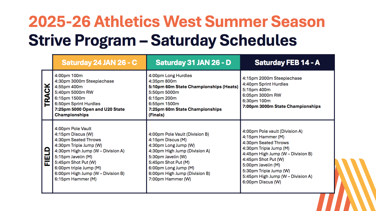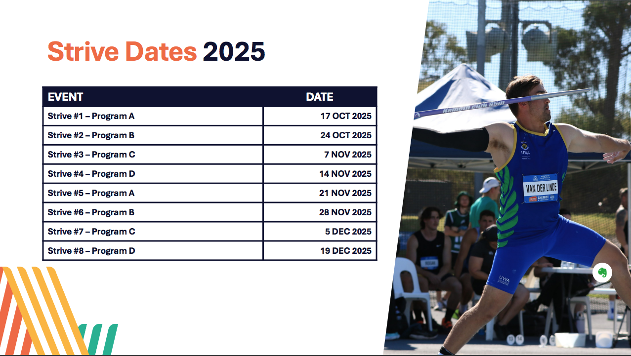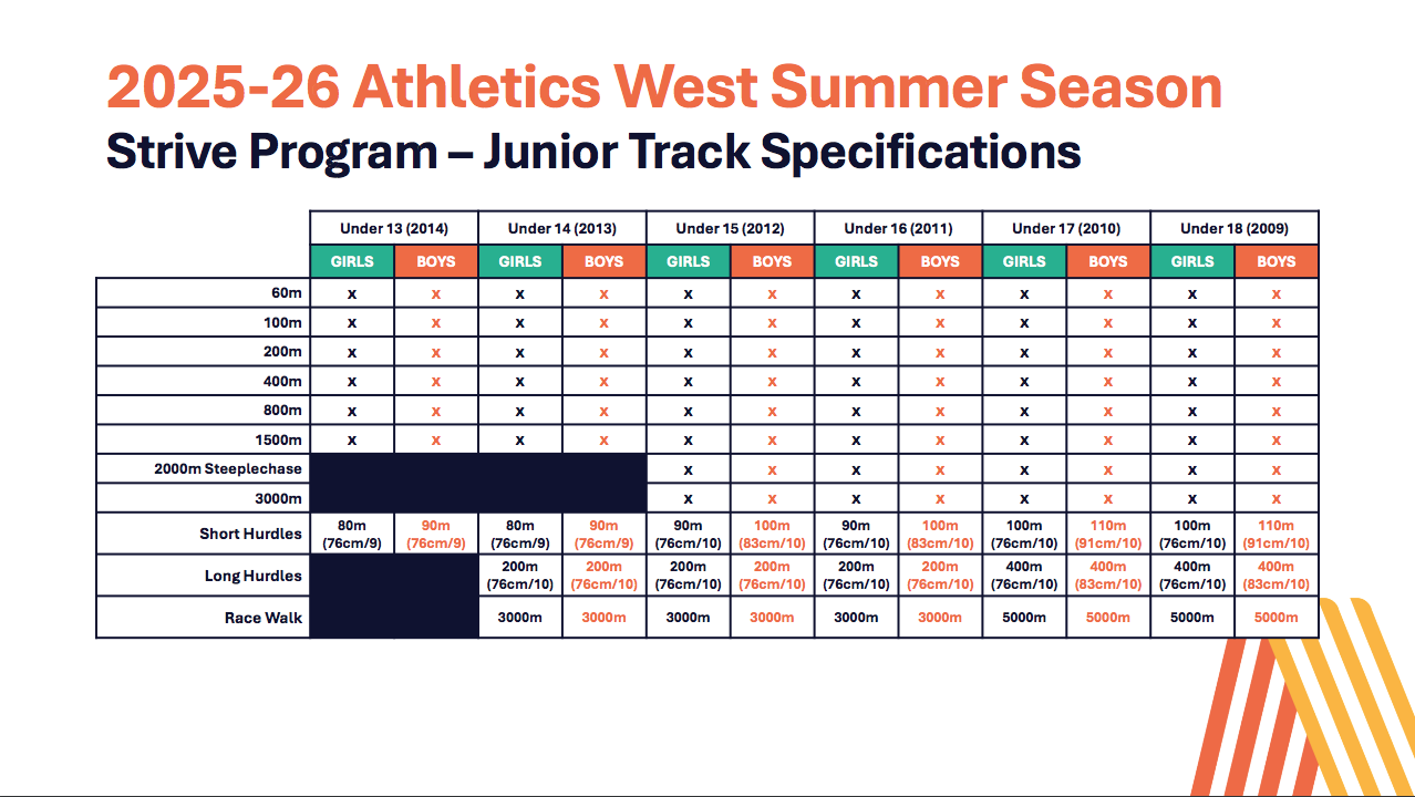 To compete in the Strive Program events, athletes must hold either a Junior, Senior or Masters Dual membership through an Athletics West affiliated One Club, Senior Club or as an Athletics West Independent.
