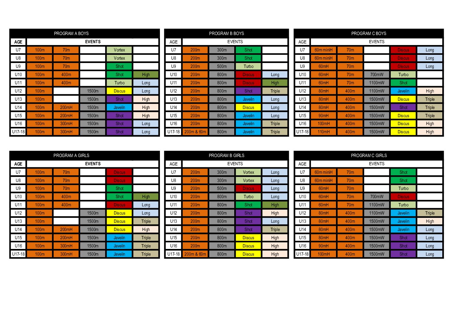 These programmed track and field competitions alternate between three programs (A, B & C). Each program will see your child compete in 3-5 events against different kids from other clubs. This allows athletes to compete in each event up to four-five times over the season.